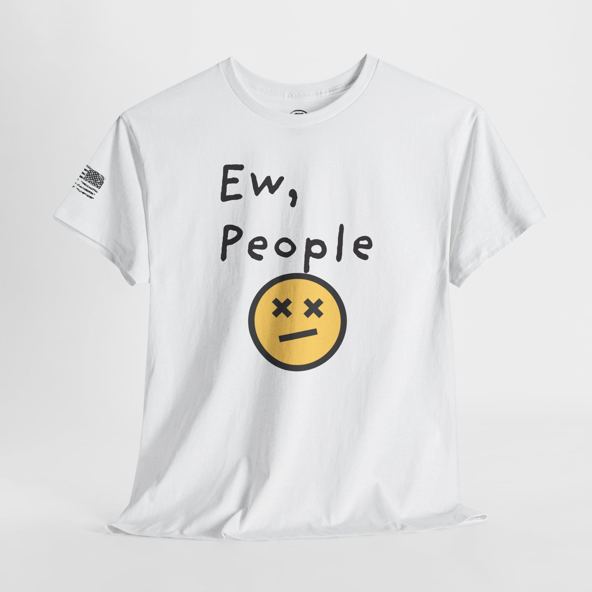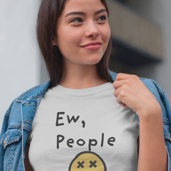 Ollie's funny and relatable 'Ew, People' T-shirt perfect for introverts and those with a sense of humor. Great for everyday wear or as a casual statement piece. Ideal for those who enjoy staying in or need a conversation starter. Relevant for gift-giving occasions such as birthdays, Christmas, and Secret Santa exchanges.
