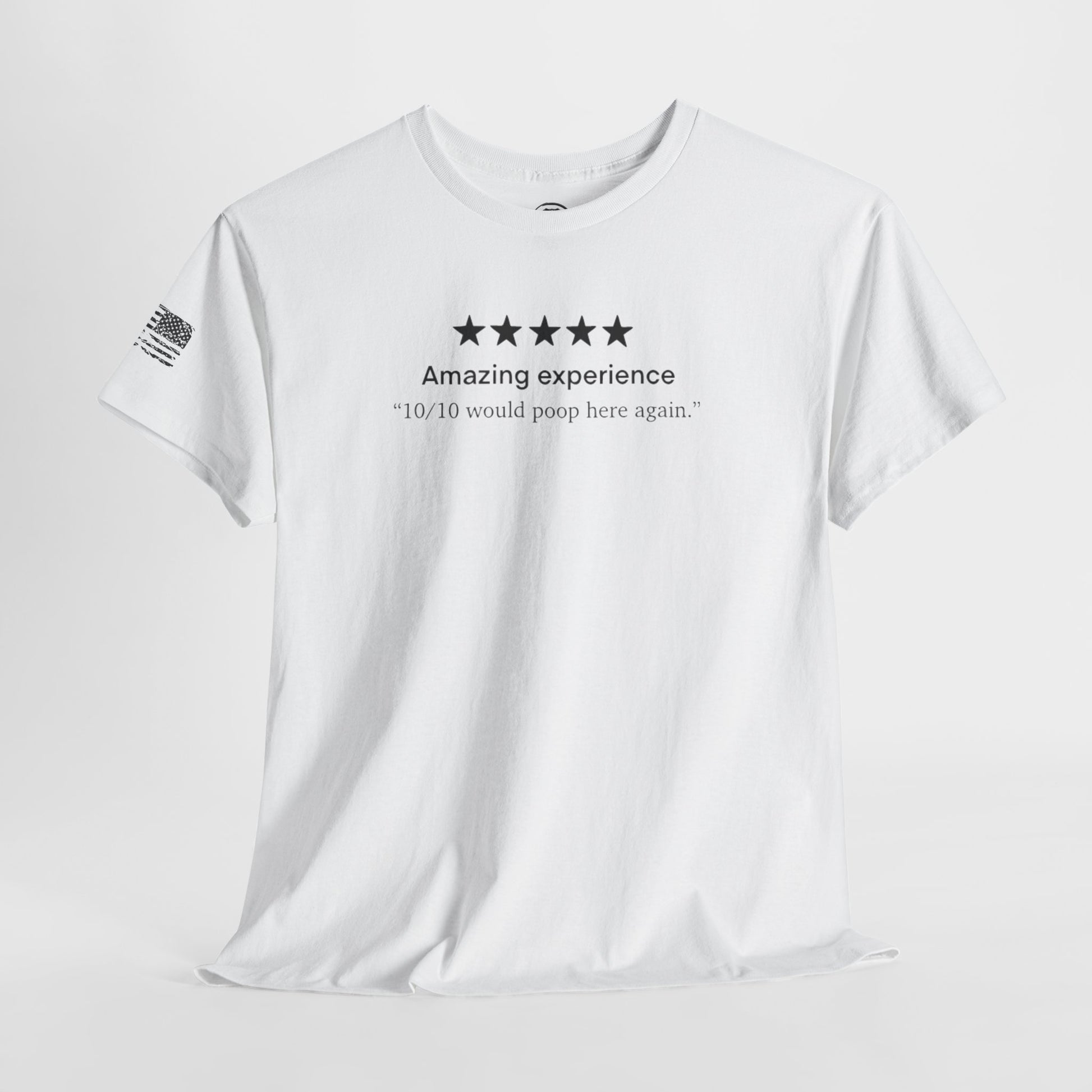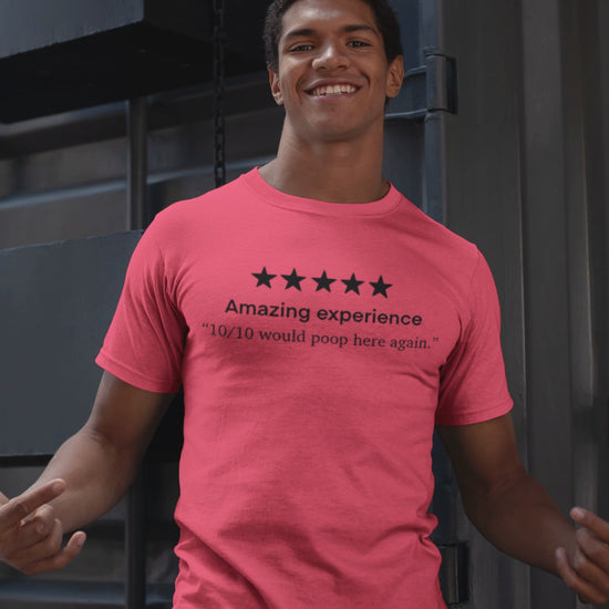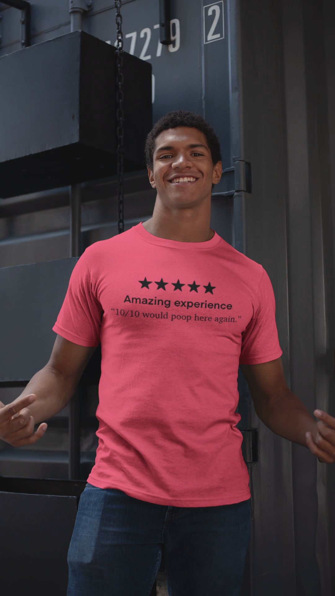 Ollie's: 'I Would Poop Here Again' T-Shirt exudes a playful and humorous vibe, making it perfect for those with a quirky sense of humor. It can be a fun addition to casual outfits and is relevant for those who enjoy lighthearted and witty clothing. Ideal for gifting on birthdays, holidays, and other special occasions.