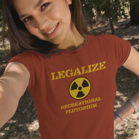 Ollie's: 'Legalize Recreational Plutonium' design on a comfortable and durable T-shirt made of 100% cotton. The classic fit and crew neckline make it suitable for any occasion, from casual to semi-formal. Relevant for individuals with a quirky sense of humor looking for a unique statement piece. Perfect for gifting on birthdays, holidays, or for science enthusiasts.