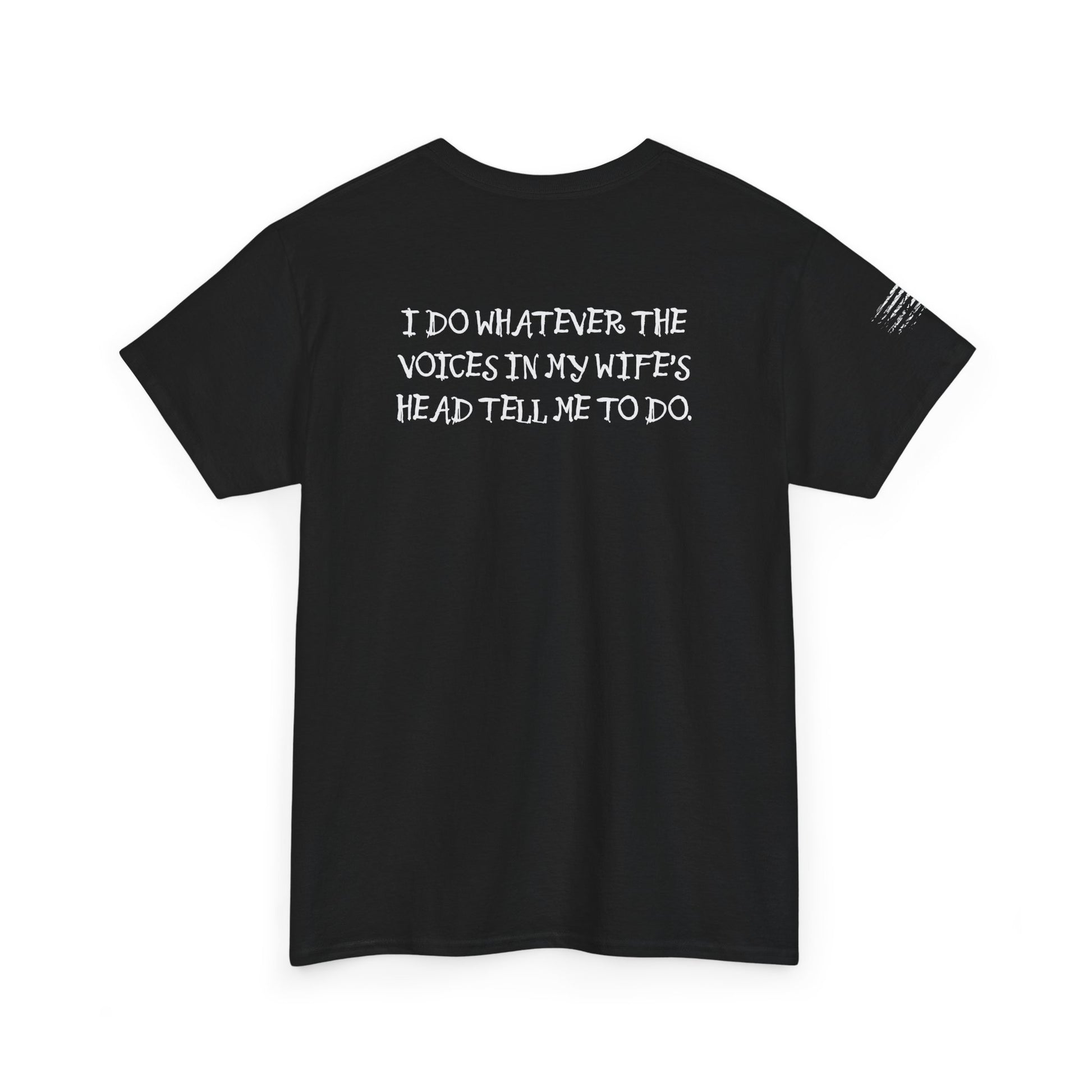 This funny tee with the design 'Voices In My Wife's Head' is perfect for those who appreciate humor and want to add a light-hearted touch to their outfit. It is ideal for adults looking for a casual and comfortable piece to wear on everyday occasions or special events. This tee is relevant to holidays like Father's Day, Valentine's Day, or birthdays.
